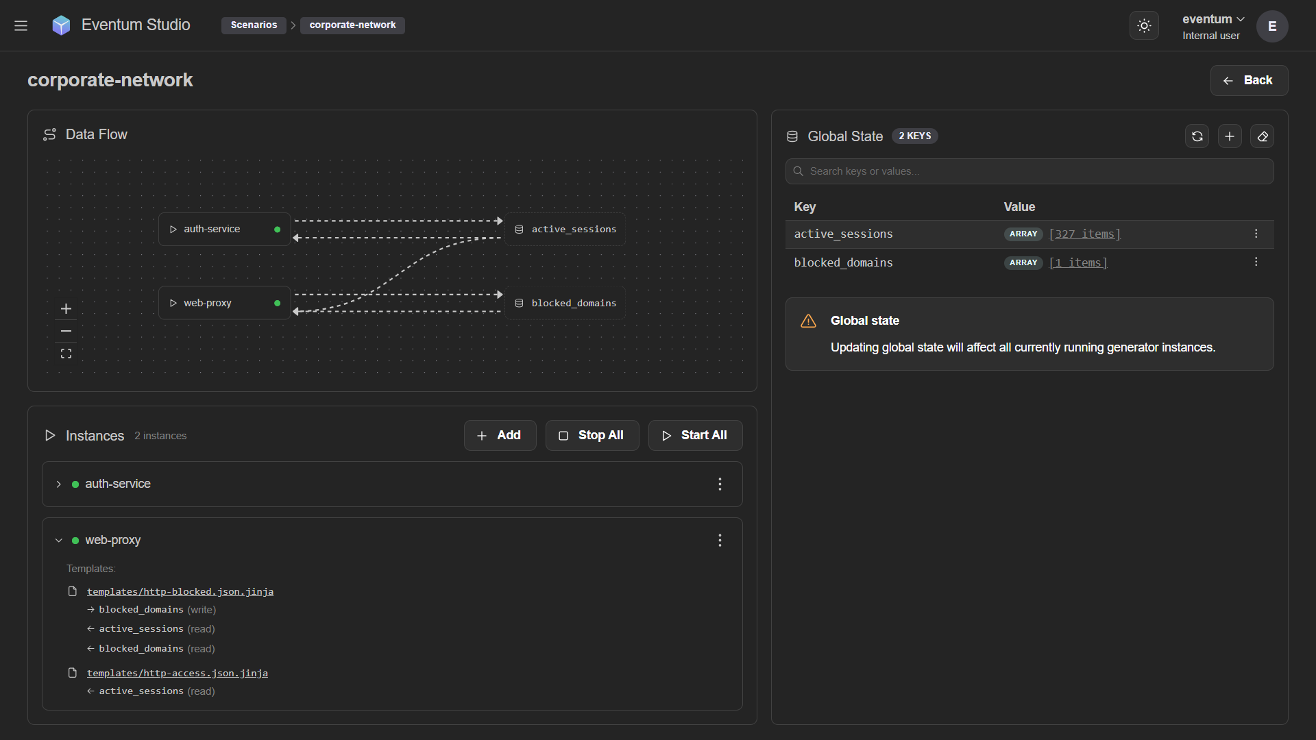 Click into a scenario and you get the Scenario page — an interactive Data Flow diagram that visualizes how instances connect through shared state, plus a Global State panel for inspecting and editing state at runtime.