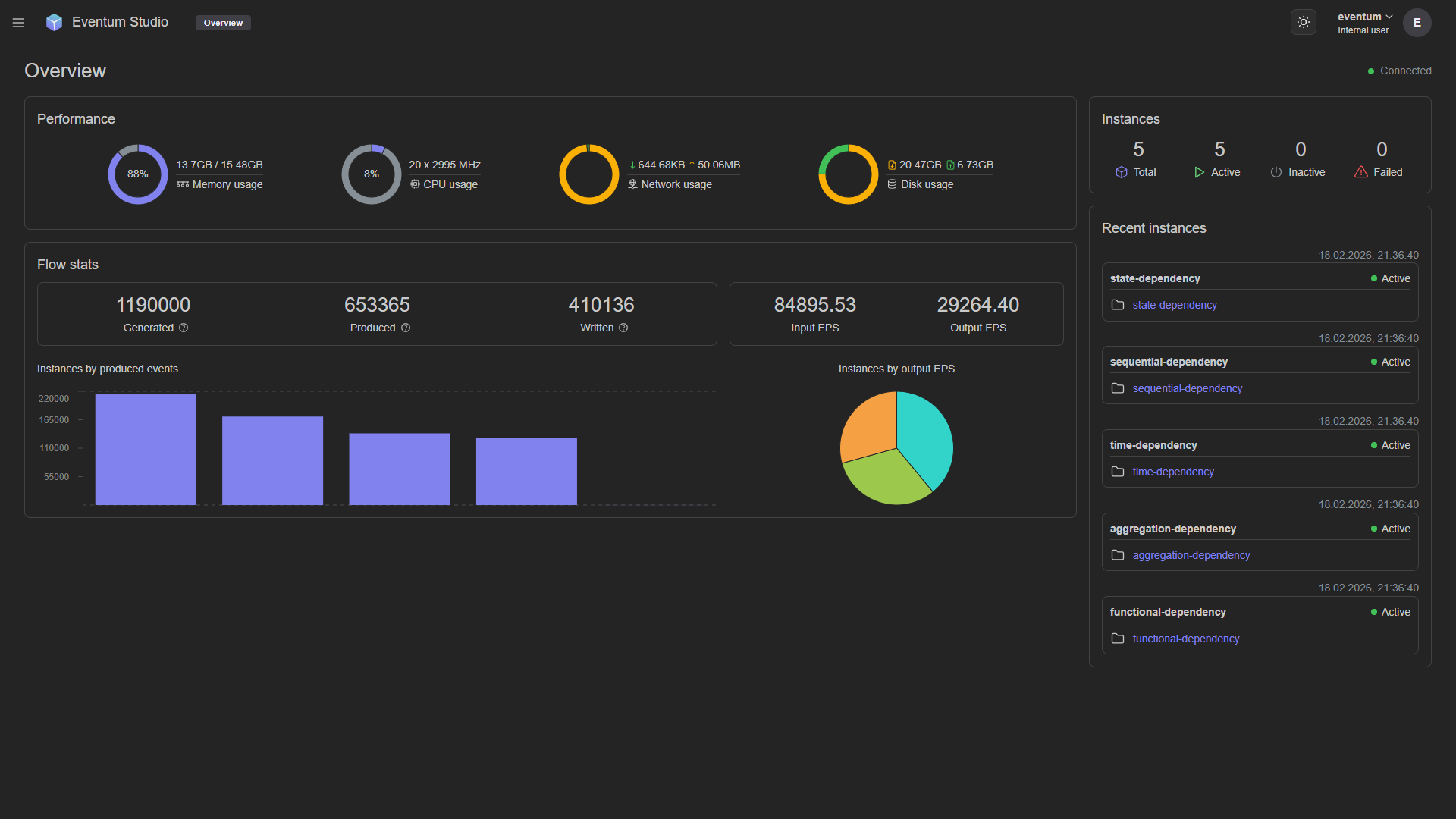 The Overview page is the first thing you see when you open Studio. It provides a real-time snapshot of the system — resource consumption, event flow statistics, throughput charts, and the status of all generator instances.
