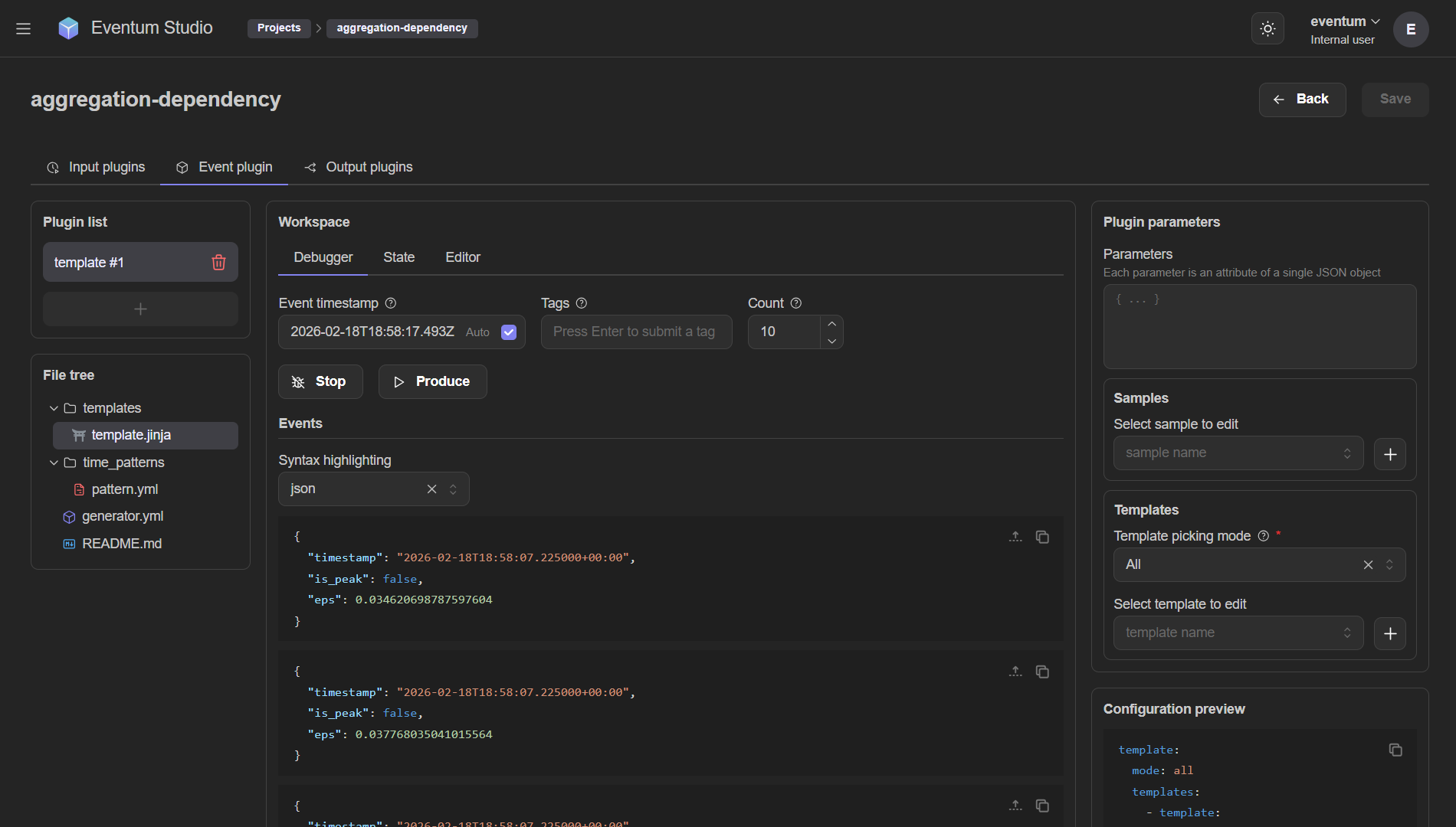 The Event plugin tab is where you configure and debug the event plugin — the stage that turns timestamps into event strings.