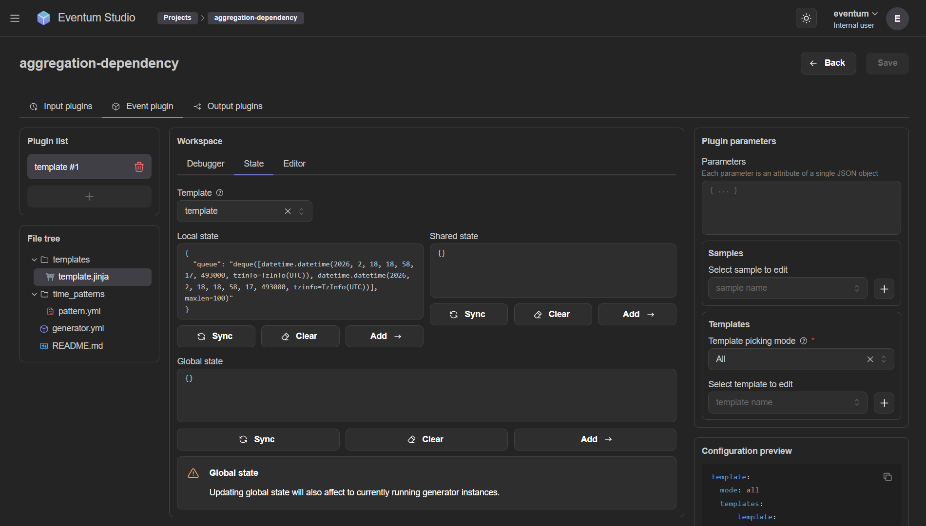 The State tab exposes the event plugin's internal state — useful for debugging stateful templates that use locals, shared, or globals.