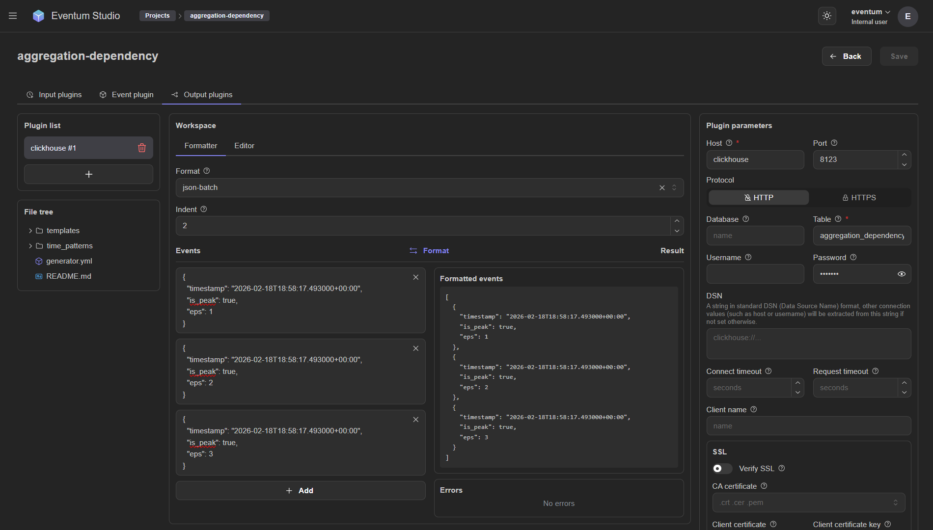 json-batch,plain,json,template,template-batch). - Indent, ... — parameters of the selected formatter.