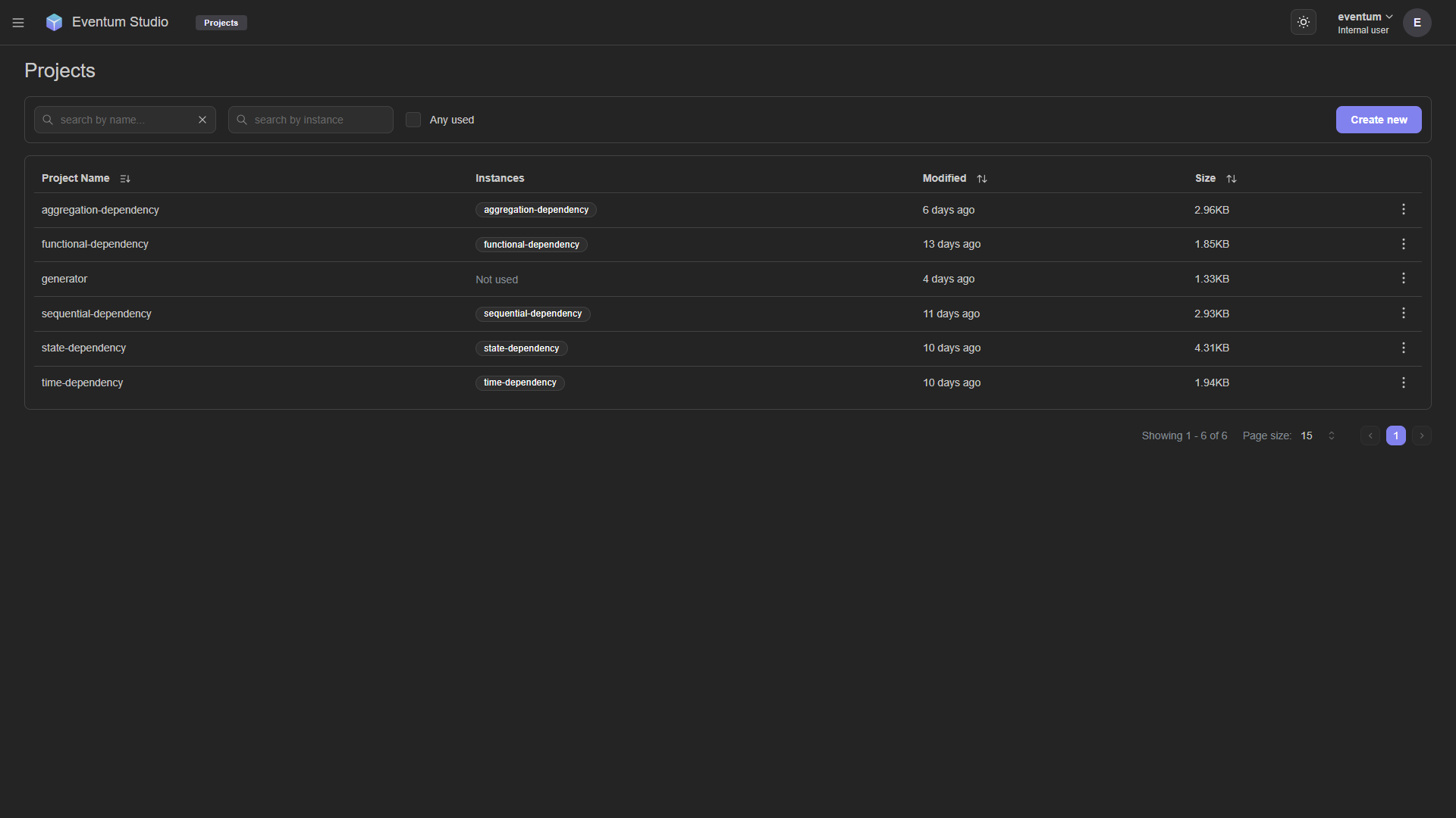 - Any used — checkbox to show only projects that have at least one instance.