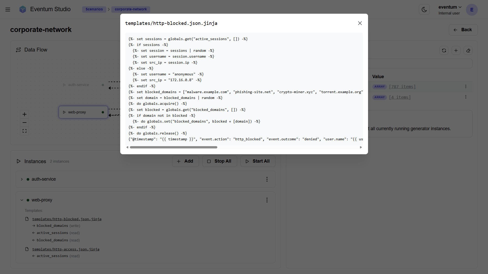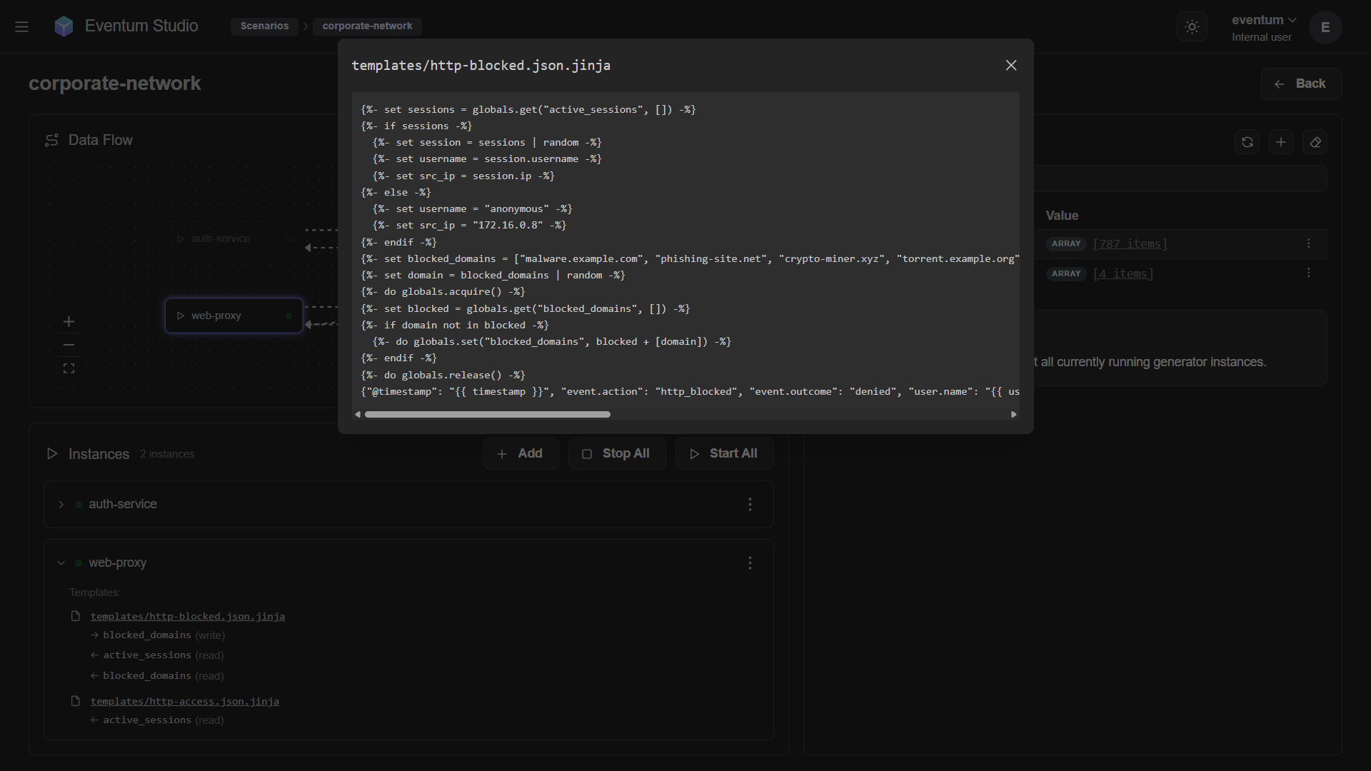Click a template name in an expanded card to open a read-only preview of the template source. This lets you see how globals.set() and globals.get() are used without leaving the scenario page.